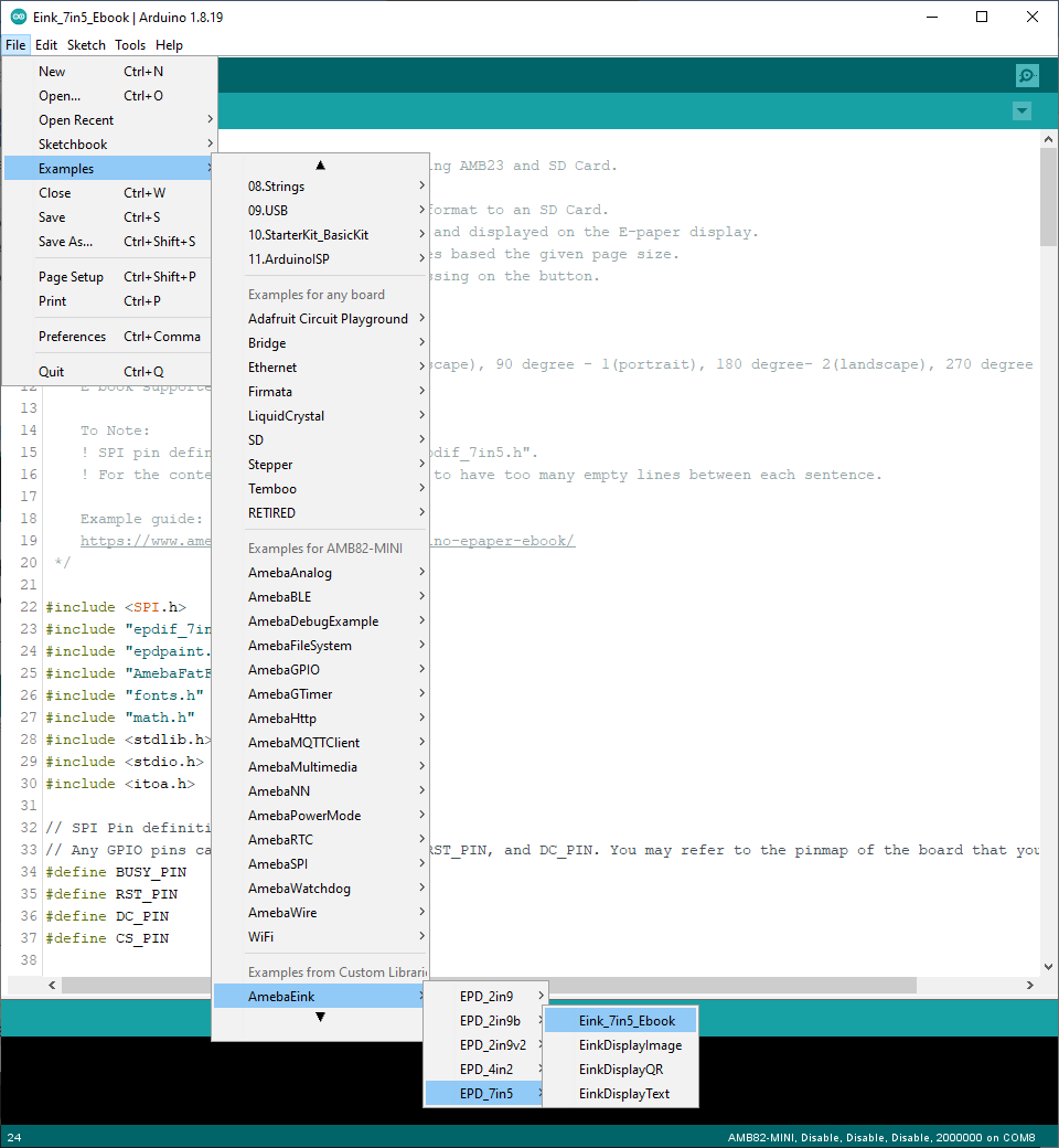 After AmebaEink.zip is installed, Open the "Eink_7in5_Ebook" example by selecting "File" -> "Examples" -> "AmebaEink" -> "EPD_7in5" -> "Eink_7in5_Ebook".