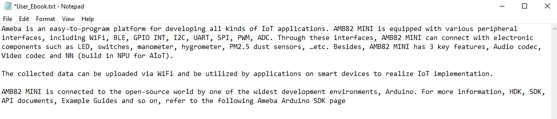 Next, insert the MicroSD card into your computer and create a new text file named "User_Ebook.txt". Then, save the content that you would like to display in the text file (Note: do only include words). The contentof "User_Ebook.txt" shown below is for illustration purposes only.