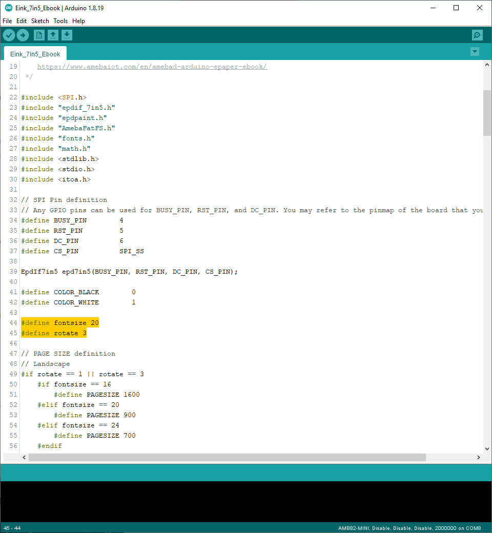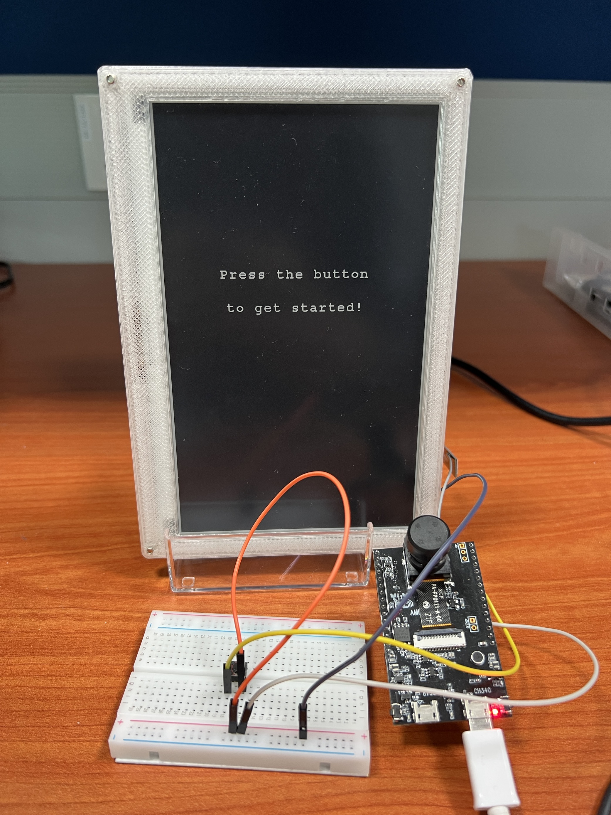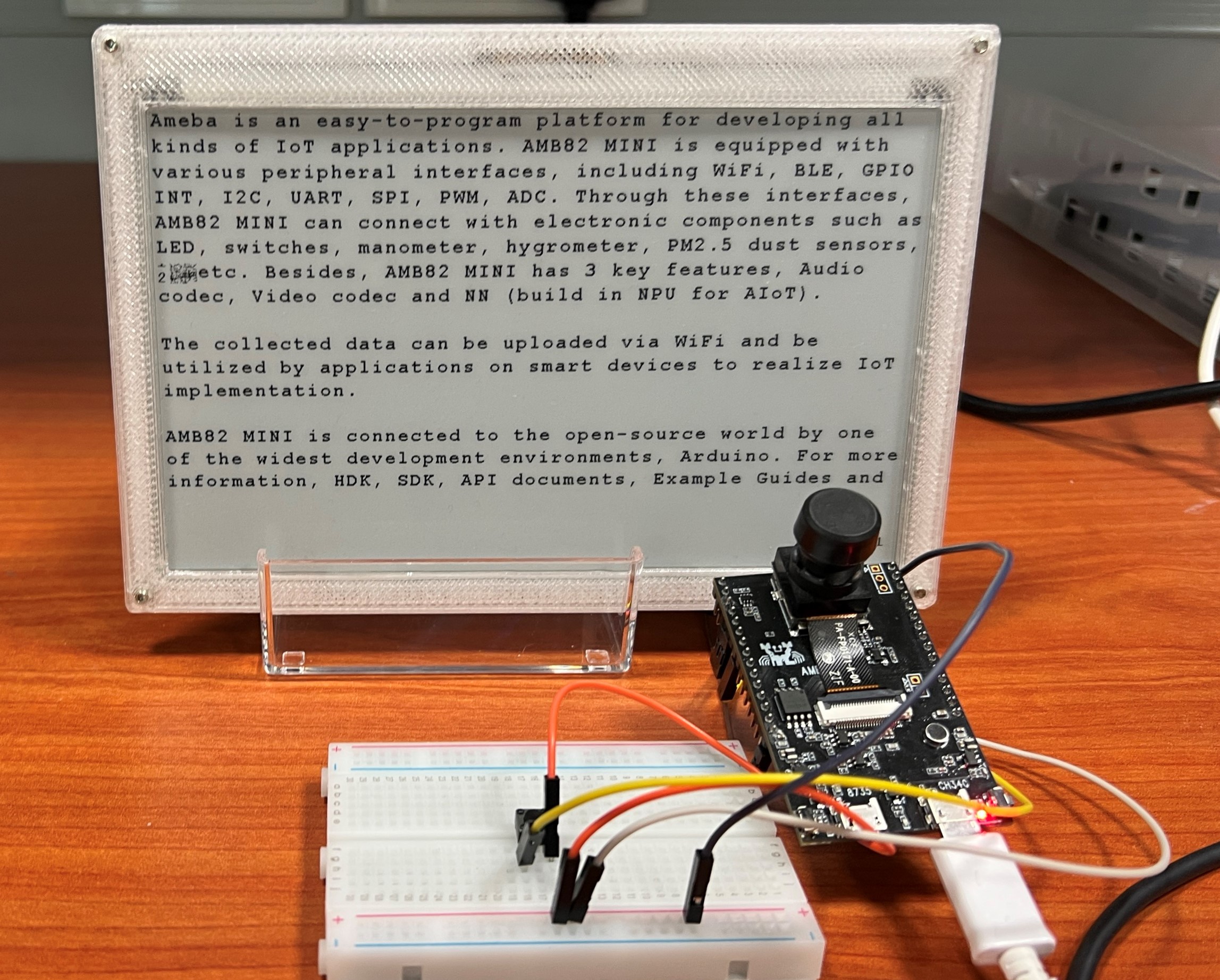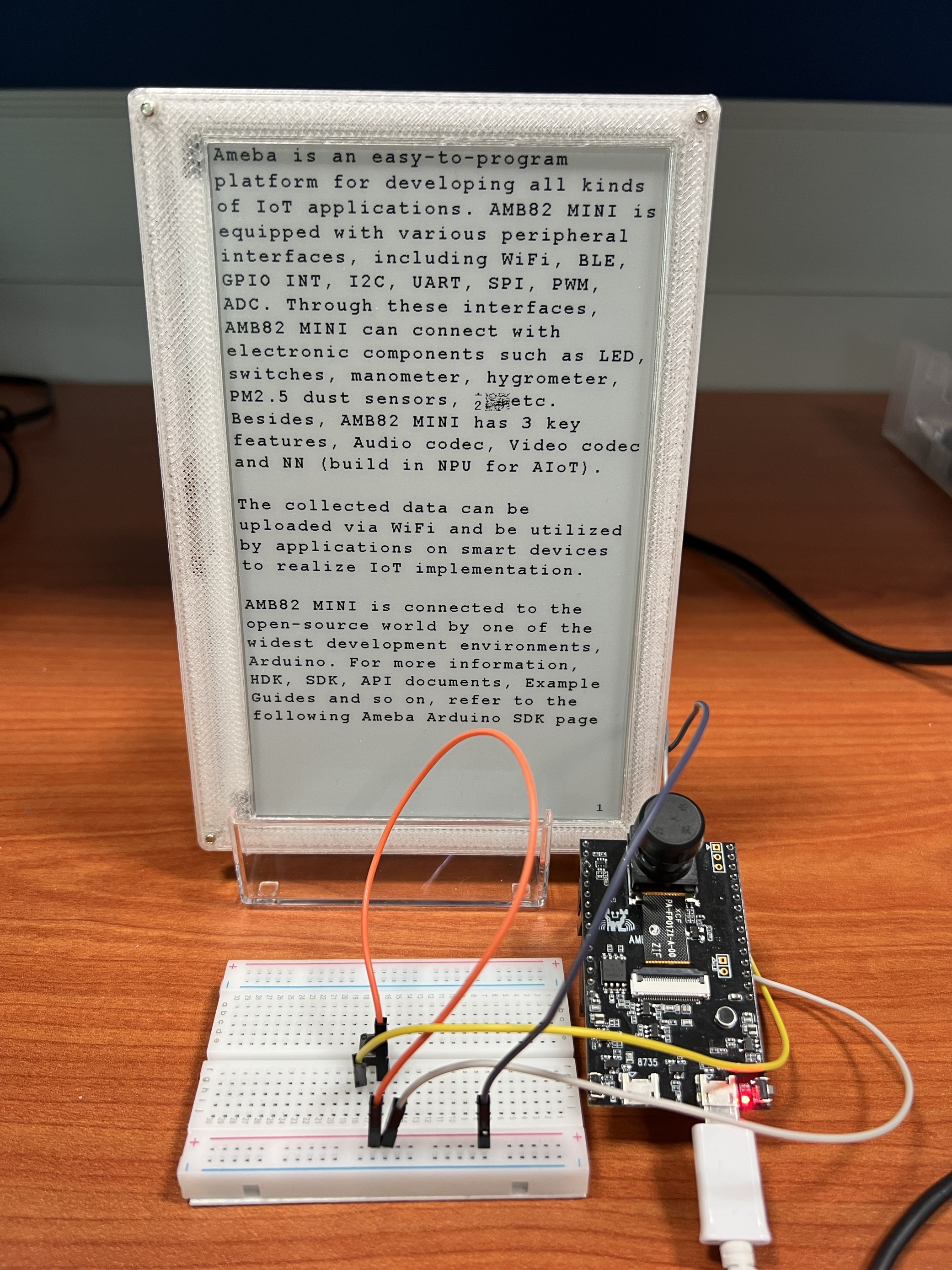Once the file is created, insert the MicroSD card into the onboard SD card reader on AMB82 Mini. Upload the code and press the reset button once the uploading is done. When the reset button is pressed, the e-Paper display will refresh and display a cover page.