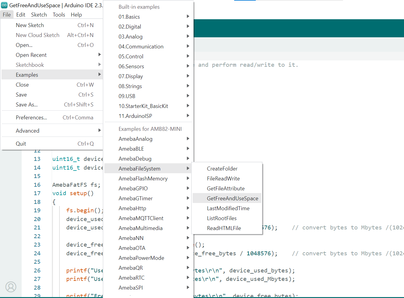Open the example, "Files" -> "Examples" -> "AmebaFileSystem" -> "GetFreeAndUseSpace".