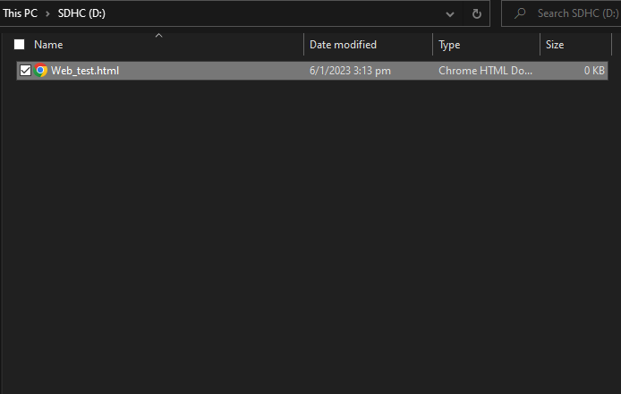 Using a card reader, connect the SD card to a computer and copy the HTML file into the SD card. Take note to place the file in the root directory and not in any folder. The HTML sample file can be downloaded at https://github.com/ambiot/ambpro2_arduino/tree/dev/Ameba_misc/Example_Samples/Web_test.html.