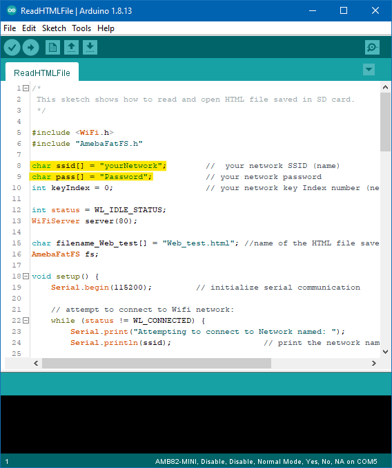 Open the example, "Files" -> "Examples" -> "AmebaFileSystem" -> "ReadHTMLFile"