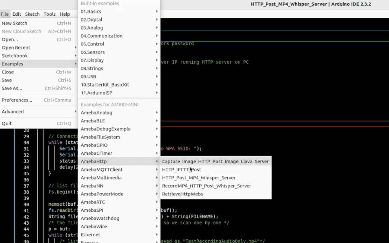 Then open "File" -> "Examples" -> "AmebaHttp" -> "Capture_Image_HTTP_Post_Image_Llava_Server"