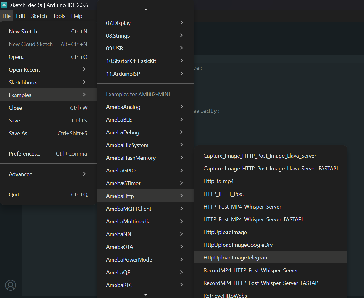 Open "File" -> "Examples" -> "AmebaHTTP" -> "HttpUploadImageTelegram".