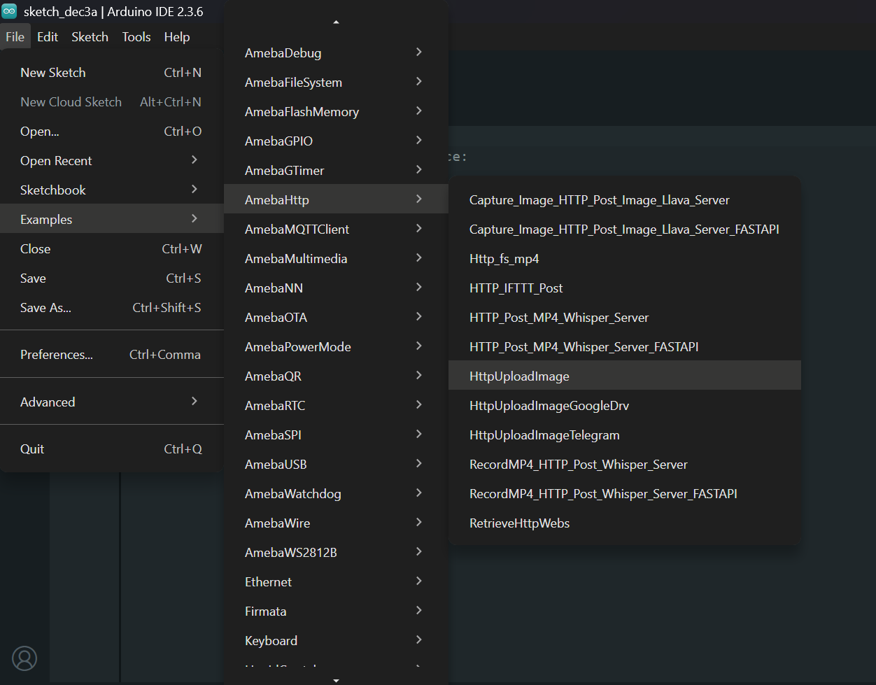 Open "File" -> "Examples" -> "AmebaHTTP" -> "HttpUploadImage".