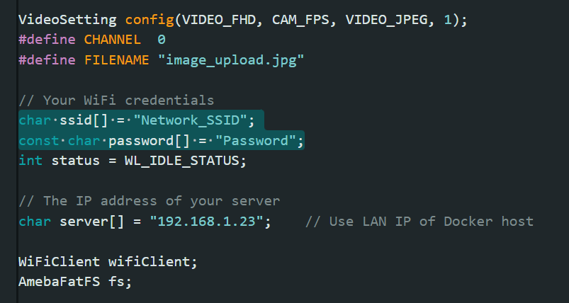 Update WiFi credentials and server IP. Kindly use LAN IP of the Docker host.
