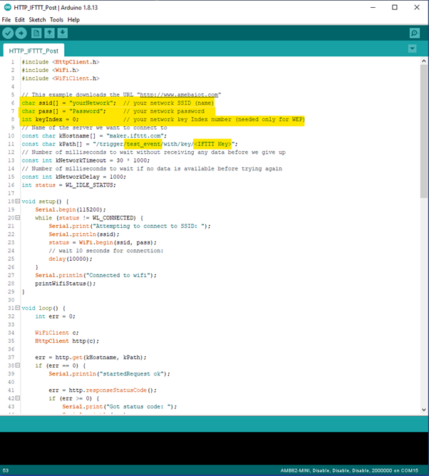 To run the example, HTTP POST feature of the Ameba is used to post a simple webhook service that is received by IFTTT platform and in turn be used to trigger a response (sending an email).