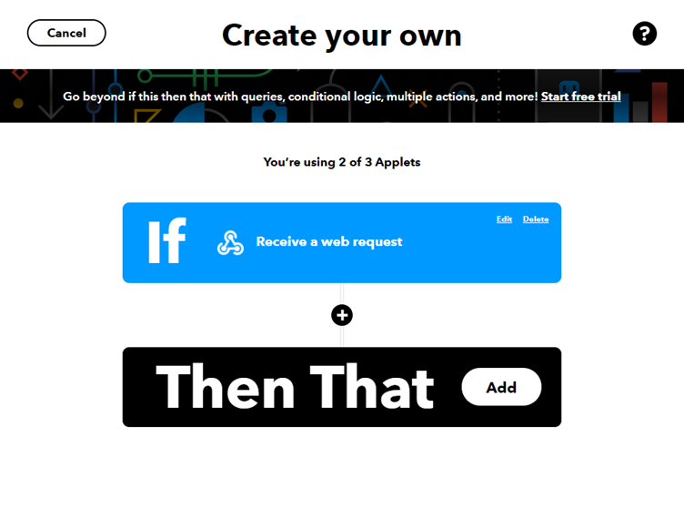 You may follow the same steps previously in "Generate Applet from IFTTT" section to create a Webhooks service as the trigger. The Event Name required to identify the trigger will remain as "test_event". Next, click the "Add" button in "Then That" field to create the action service taken in response to the last trigger.