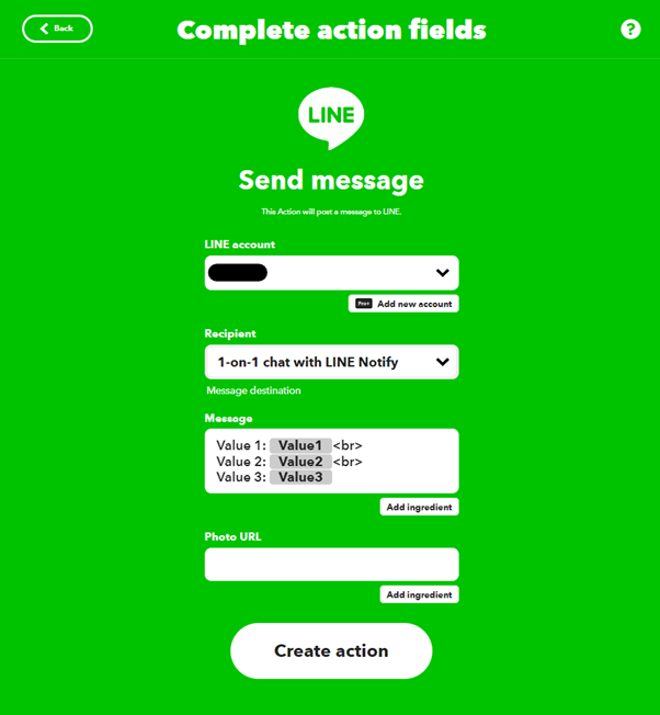Select LINE account, set the Recipient to "1-on-1 chat with LINE Notify" which means the message triggered by IFTTT will directly send to your chats. Next, input your desired message in the input box under "Message". For sending images, you can insert a link to your photo in the input box under "Photo URL".