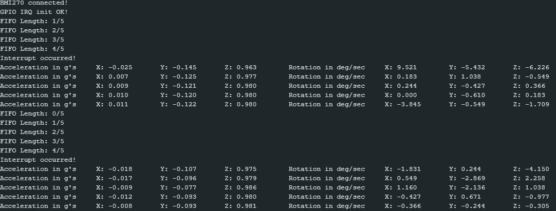 This example shows how to use SparkFun 6DoF BMI270 to get basic measurements using I2C based on FIFO buffer.