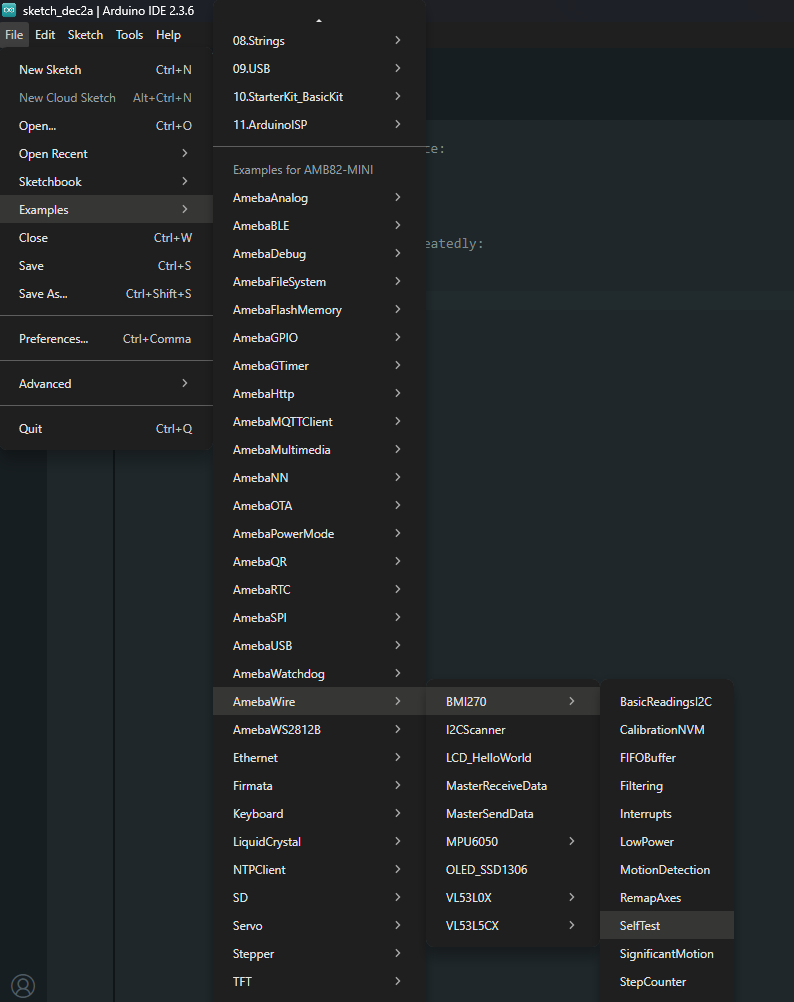 Open the example in "File" -> "Examples" -> "AmebaWire" -> "BMI270" -> "SelfTest".