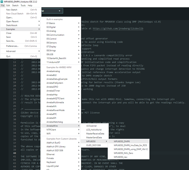 Open the example in "File" -> "Examples" -> "AmebaWire" -> "MPU6050"-> "MPU6050_DMP6" or "MPU6050_DMP6_using_DMP_V6v12"