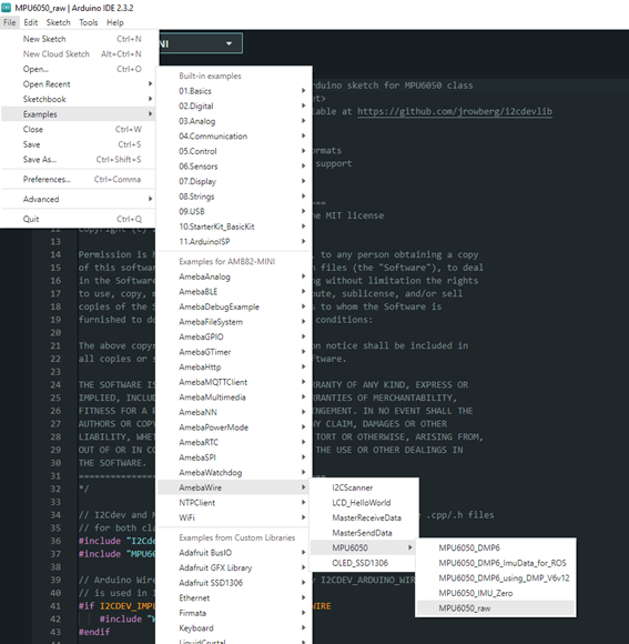 Open the example in "File" -> "Examples" -> "AmebaWire" -> "MPU6050"-> "MPU6050_raw".