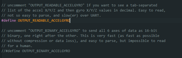 You may choose to uncomment #define OUTPUT_BINARY_ACCELGYRO and comment #define OUTPUT_READABLE_ACCELGYRO to transmit the raw data faster.
