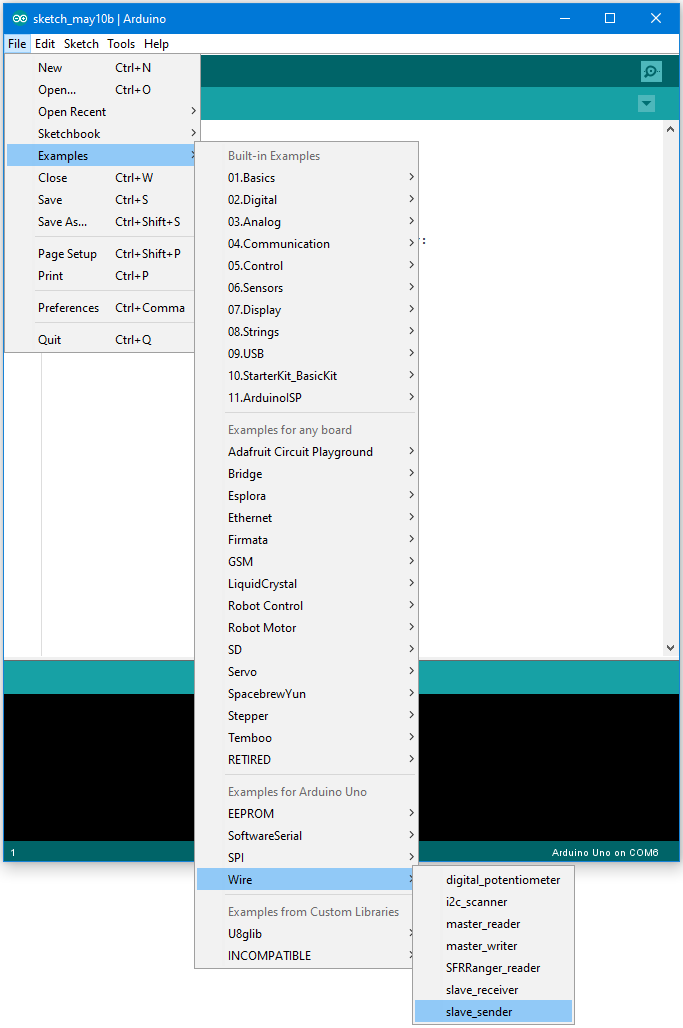 Then click "Sketch" -> "Upload" to compile and upload the example to Arduino Uno.