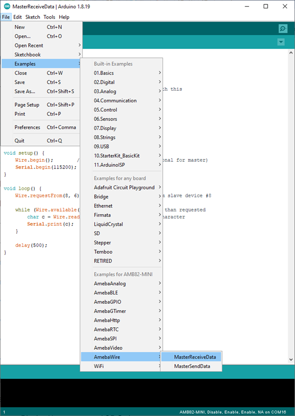 In the example "I2C - Send Data to Arduino Uno", Ameba, the I2C master, transmits data to the Arduino UNO, the I2C slave. As to this example, Ameba is the I2C master, and receives data from the Arduino UNO, which is the I2C slave.