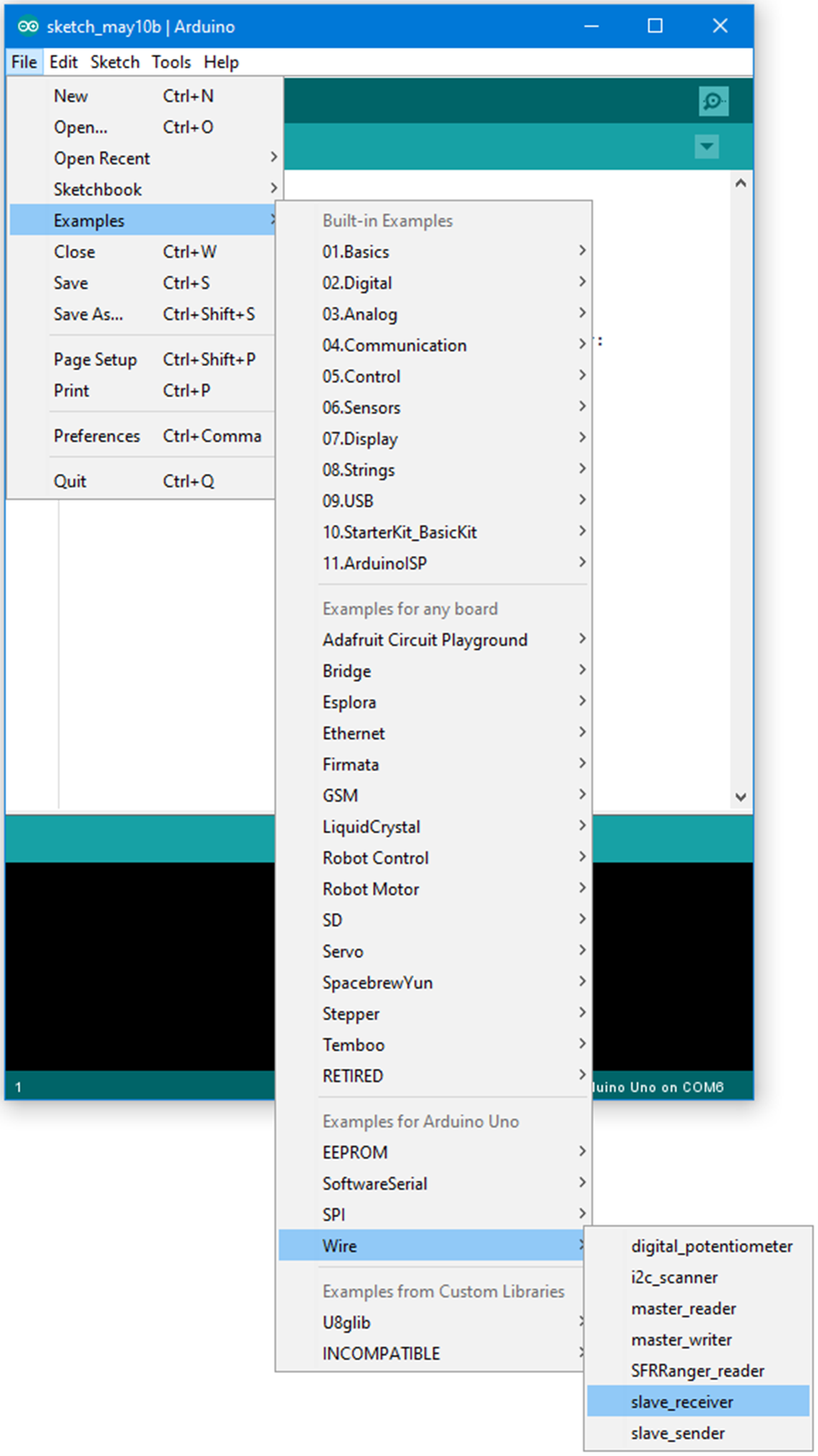 Then click "Sketch" -> "Upload" to compile and upload the example to Arduino Uno.