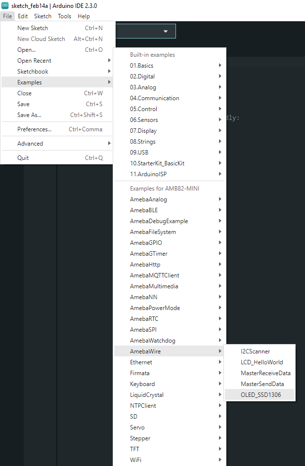 Open the example in "File" -> "Examples" -> "AmebaWire" -> "OLED_SSD1306".