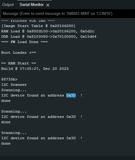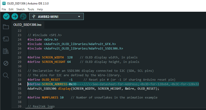 If the address doesn't work for you, you can run I2CScanner to find the OLED address by navigating to "File" -> "Examples" -> "AmebaWire" -> "I2CScanner".