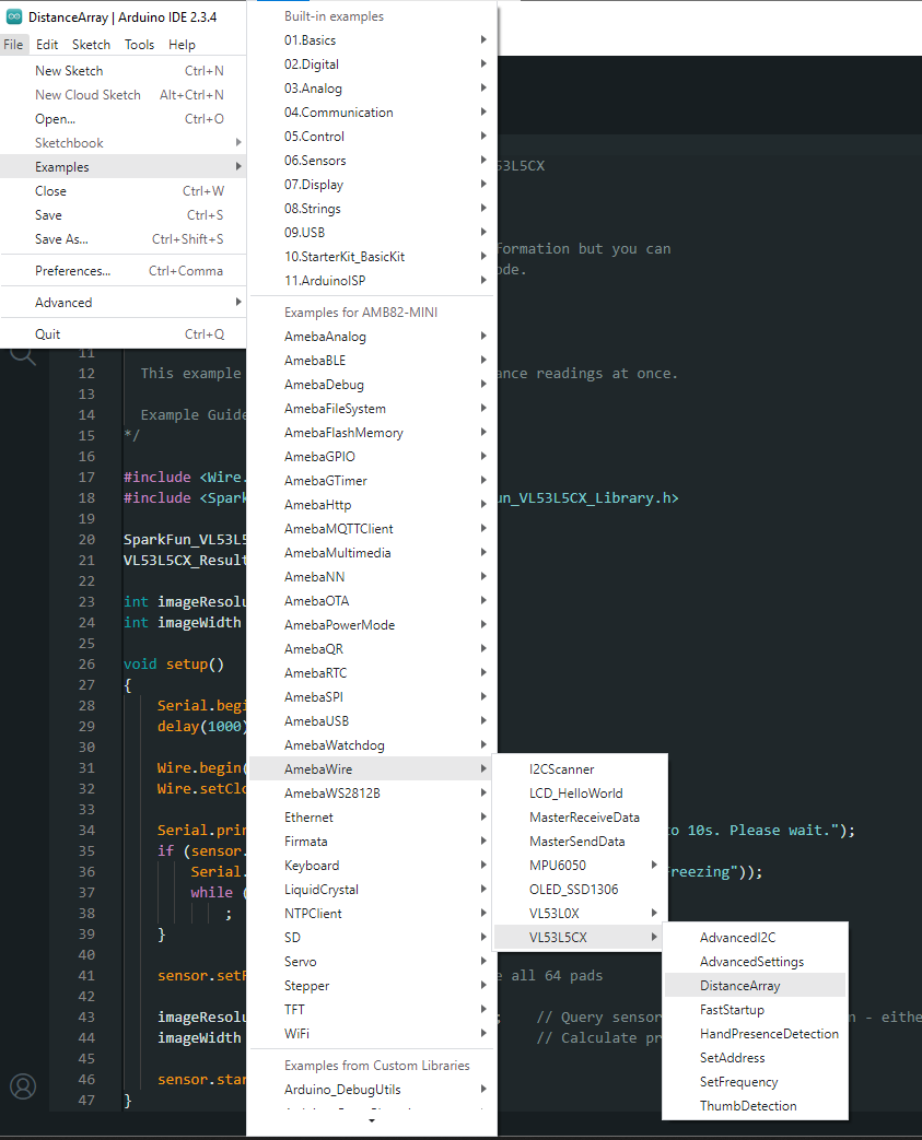 Open the example in "File" -> "Examples" -> "AmebaWire" -> "VL53L5CX" -> "DistanceArray".