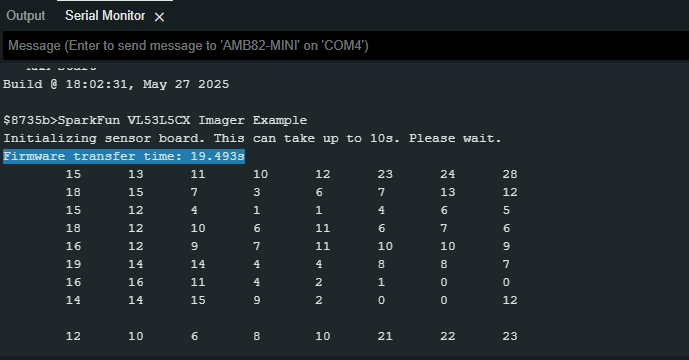 This example shows how to use the SparkFun VL53L5CX Time-of-Flight sensor on AMB82 Mini and how to setup the I2C bus to minimize the amount of time taken to init the sensor.