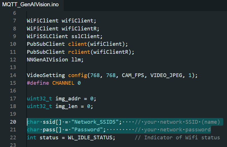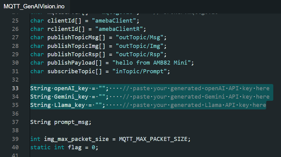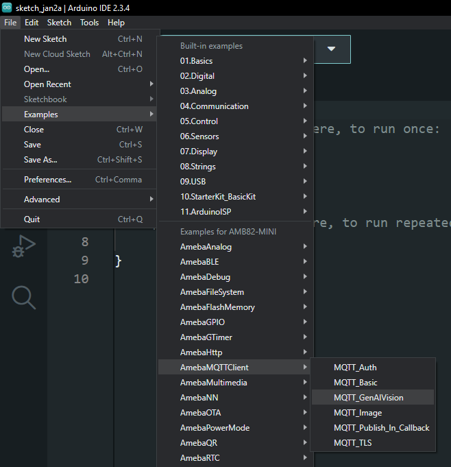 Open Generative AI Vision with MQTT example in "File" -> "Examples" -> "AmebaMQTTClient" -> "MQTT_GenAIVision".