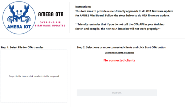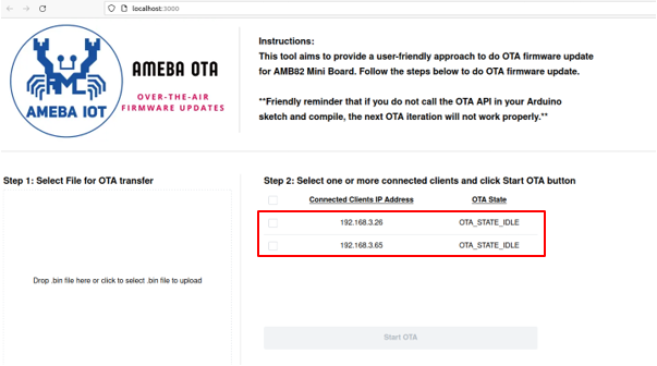 Then, go to Ameba OTA Web UI [http://localhost:3000/] to view the connected device(s).
