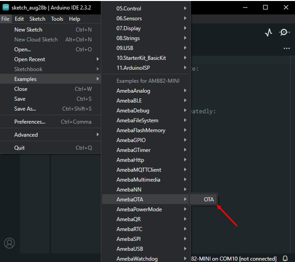 To begin, open the OTA example in Arduino IDE. "File" -> "Examples" -> "AmebaOTA" -> "OTA".