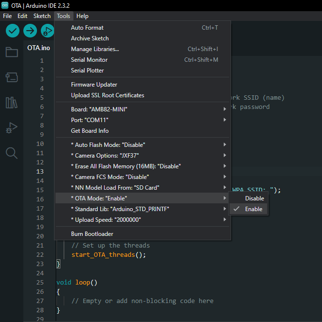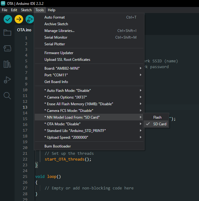 Before compiling, remember to set NN Model to load from SD card and enable OTA mode.
