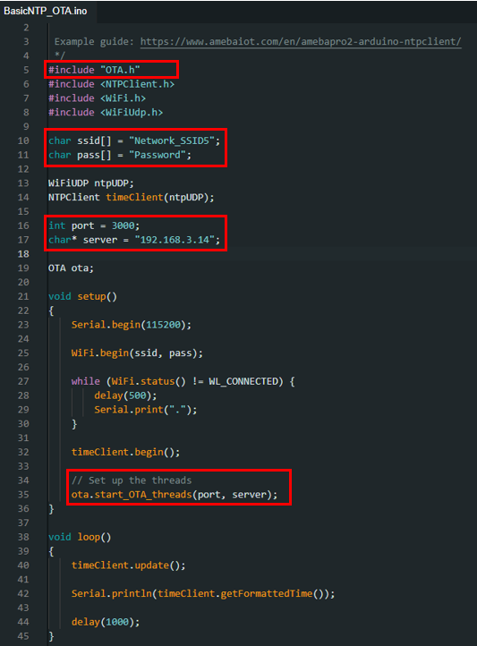 In this tutorial, we will be uploading a NTPClient sketch via OTA. Open the NTPClient example. "File"-> "Examples" -> "NTPClient" -> "Basic". Include the header file OTA.h and at the end of setup function, add in the API start_OTA_threads and define the port number and ip address according to your HTTP server. Also modify the SSID and password according to your AP. Refer to the picture below for the modified NTPClient sketch.