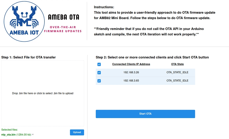 If you can see the IP address(es) of your AMB82 Mini board(s) on the OTA webpage, it shows that the connection is successful.