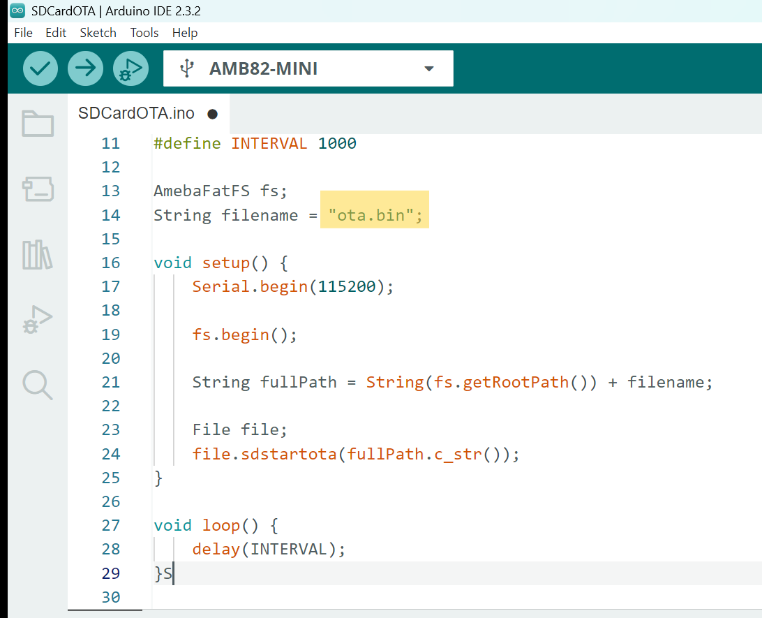 To begin, open the OTA example in Arduino IDE. "File" -> "Examples" -> "AmebaOTA" -> "SDCardOTA".