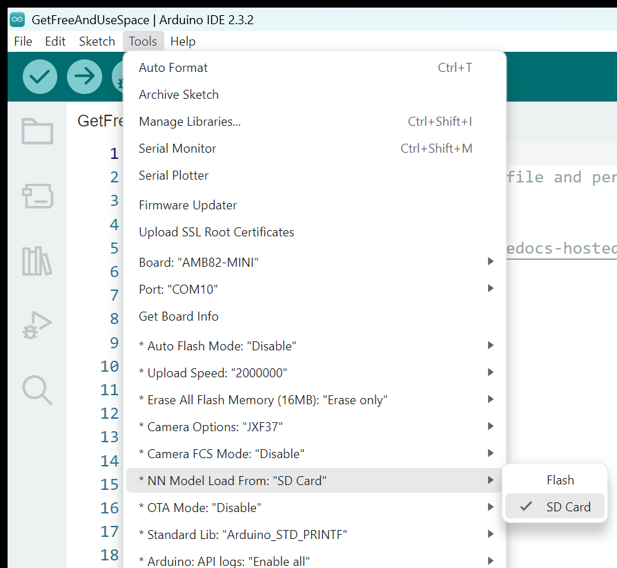 Partition Notice: Arduino IDE will only upload successfully when both Step 1 and Step 2 above are selected. All NN examples that integrate with OTA must load the model from the SD card.