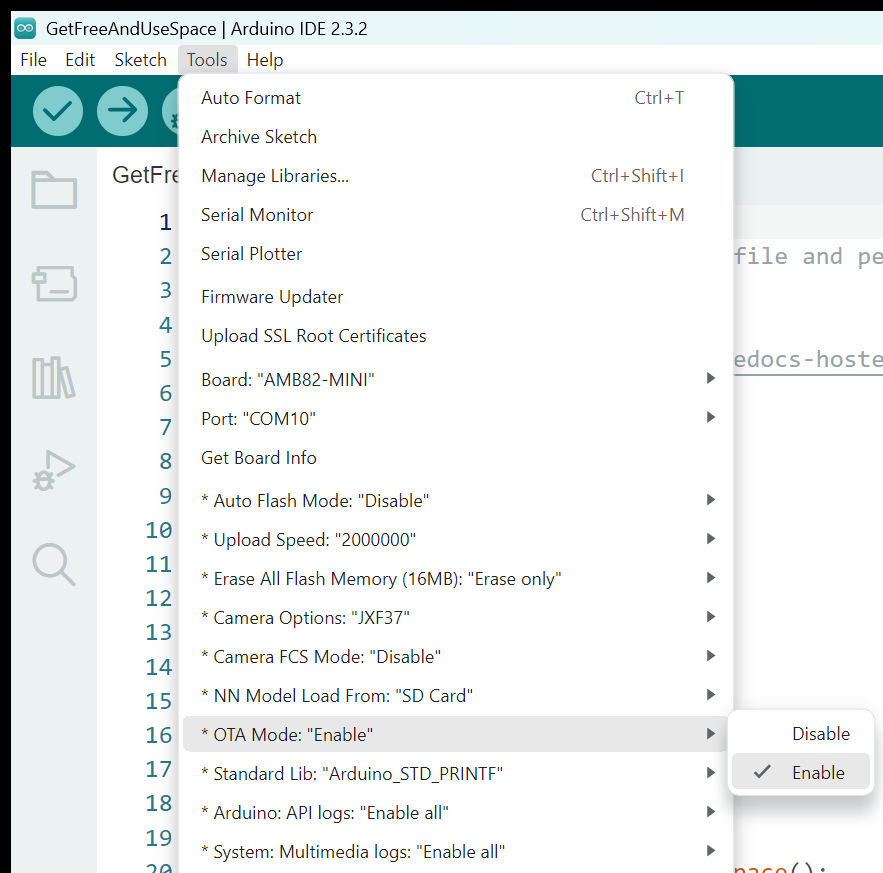 In this tutorial, we will be uploading a GetFreeAndUseSpace sketch via OTA. Open the GetFreeAndUseSpace example. "File"-> "Examples" -> "AmebaFileSystem" -> "GetFreeAndUseSpace".