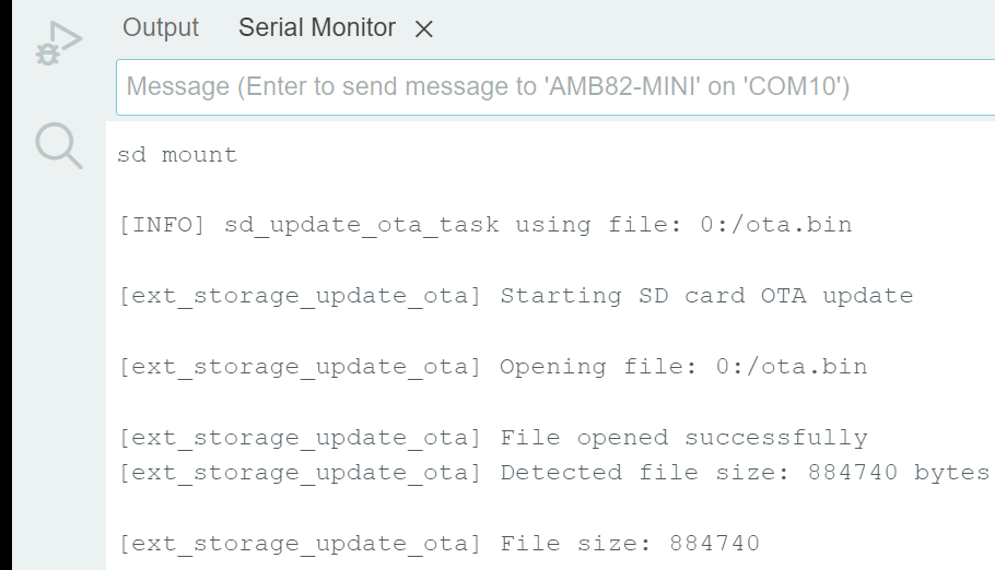 You will see the board automatically read ota.bin from the SD card and perform the update, as shown in the figure below.