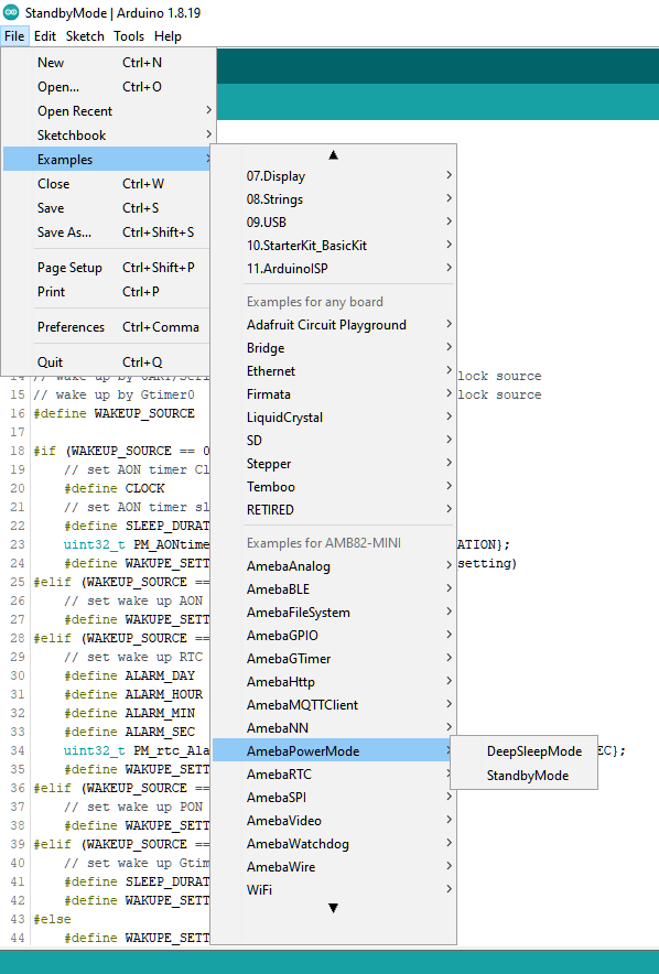 Open example in "File" -> "Examples" -> "AmebaPowerMode" -> "StandbyMode".