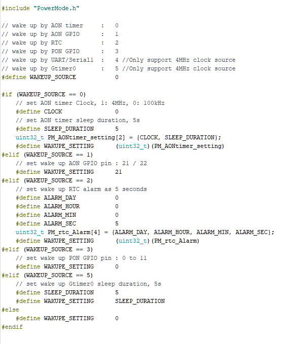For RTC, at section "#elif (WAKEUP_SOURCE == 2)", set value to "ALARM_DAY", "ALARM_HOUR", "ALARM_MIN", or "ALARM_SEC". All alarm values set the duration of RTC wake-up. The range is "1day, 0h, 0m, 0s" to "365day, 23h, 59min, 59s".