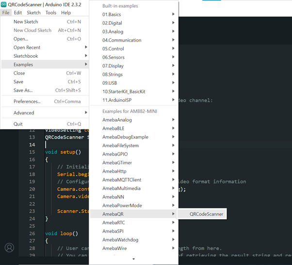 Open the QR Code Scanner example "File" -> "Examples" -> "AmebaQR" -> "QRCodeScanner"