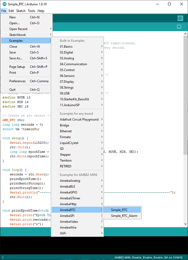 Then open the "RTC" example from: "File" -> "Examples" -> "AmebaRTC" -> "Simple_RTC":