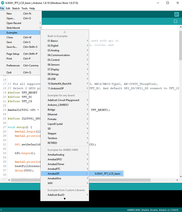 Open the example, "File" -> "Examples" -> "AmebaSPI" -> "LCD_Screen_ILI9341_TFT"