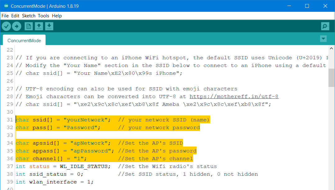 In the sample code, fill in your SSID, PASSWORD, AP SSID, AP PASSWORD and CHANNEL.