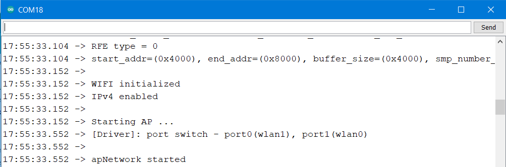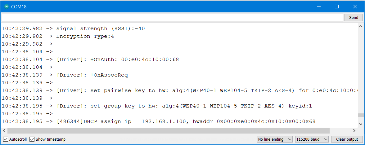 In the figure below, this message will appear in the serial monitor when a device is connected to the AP: