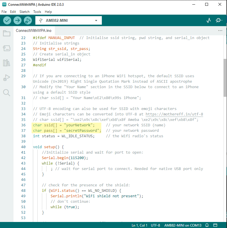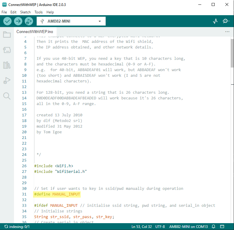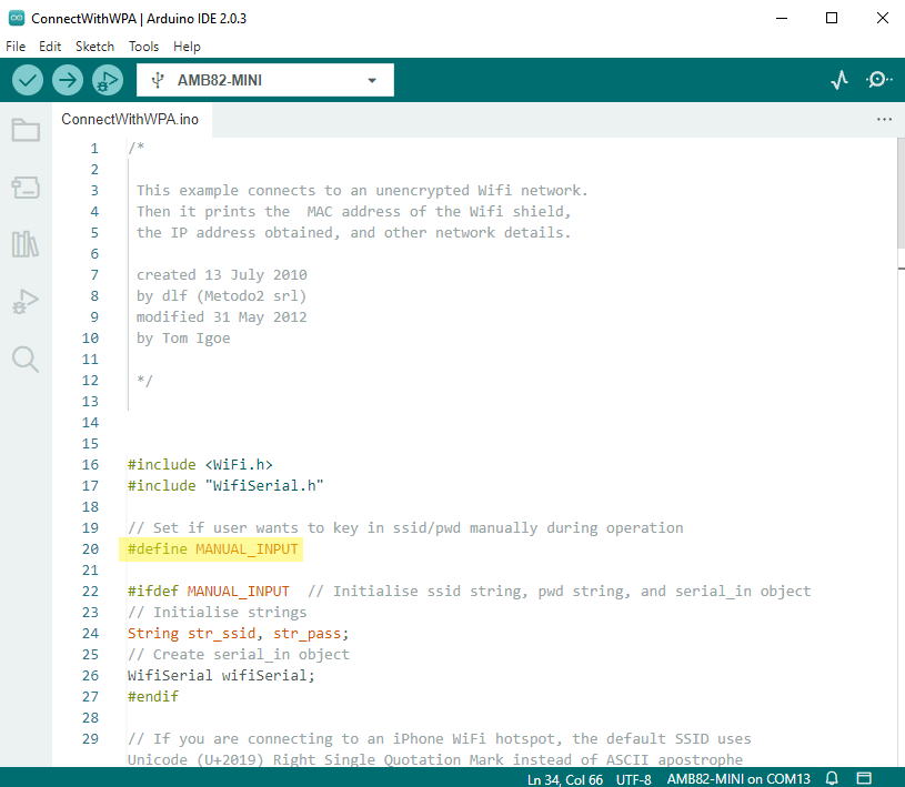If you prefer to enter your SSID & password in the Serial monitor while the program is running, uncomment #define MANUAL_INPUT at the top of the file.