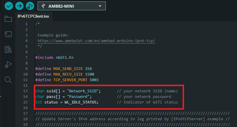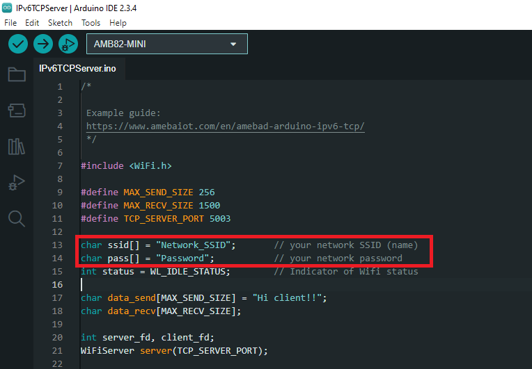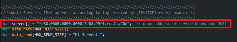 From the previous step, we obtained the server's IPv6 address. Now, copy this address into the "IPv6TCPClient" example.