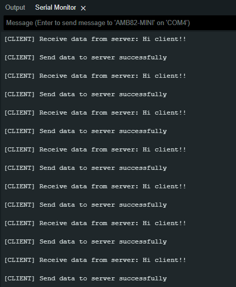 Open Serial Monitor on the port to the second AMB82 Mini, you should see server and client are sending text message to each other at the same time.