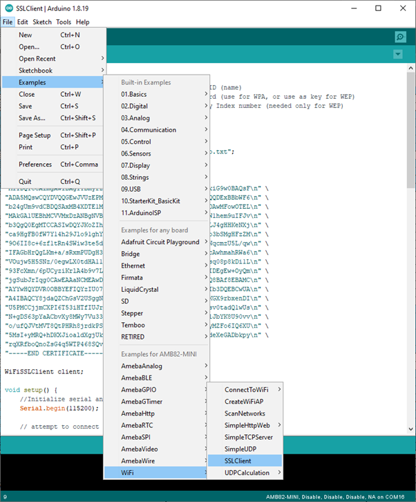 Open the "WiFiSSLClient" example in "File" -> "Examples" -> "WiFi" -> "SSLClient".