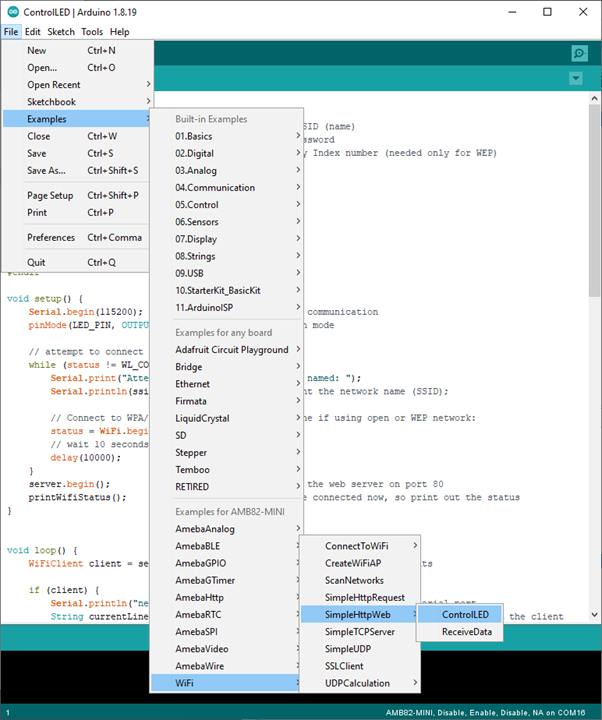 Then open "File" -> "Examples" -> "WiFi" -> "SimpleHttpWeb" -> "ControlLED"
