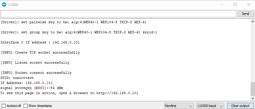 Upload the code and press the reset button on Ameba. When the connection is established, you will see the message "To see this page in action, open a browser to http://xxx.xxx.xxx.xxx" in the Arduino IDE, as shown in the figure:
