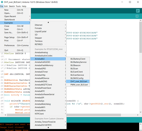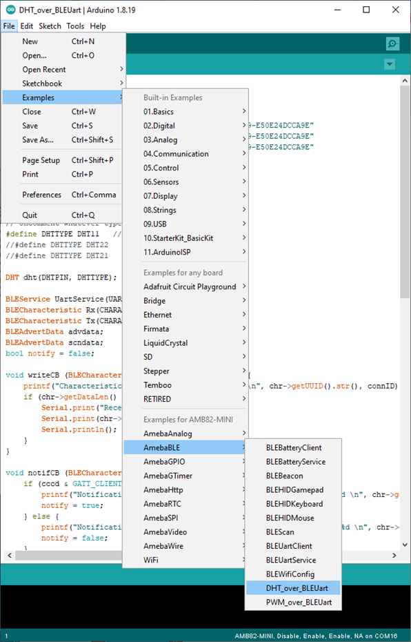Open the example, Files -> Examples -> AmebaBLE -> DHT_over_BLEUart