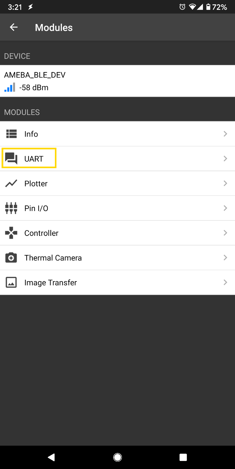 Open the app on your mobile phone, scan and connect to the Ameba board shown as AMEBA_BLE_DEV and choose the UART function in the app.